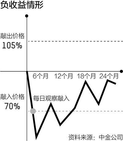 第一种是正收益情景,即发生敲出或既未敲出也未敲入。包括三种类型:若观察期内,在任一敲出观察日发生敲出事件,则产品提前终止,投资者获得年化15%的收益(具体收益率跟波动率有关,近期波动率下降,据记者了解,预期收益降至12%附近。下同);若观察期内,曾发生敲入事件,但在某一敲出观察日敲出,则产品提前终止,投资者获得年化15%的收益。即产品一旦敲出,无论观察期内是否发生敲入事件,投资者都将获得敲出收益(年化);若观察期内,未发生敲出事件,且未发生敲入事件,则产品到期时投资者获得年化15%的收益。