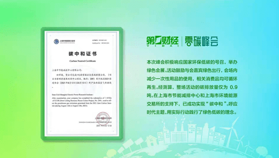 本次峰会积极响应国家环保低碳的号召,积极创办绿色会展,呼应时代主题,用实际行动践行绿色低碳的理念,会场内减少一次性用品的供应,相关消费品均可循环再生。经测算,整场活动的碳排放量仅为0.9吨。在上海市节能减排中心和上海市环境能源交易所的支持下,已成功实现“碳中和”。