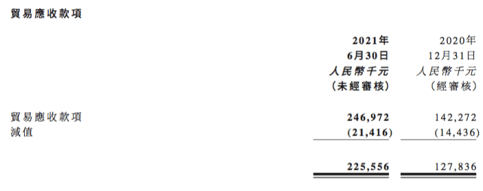 财报显示,集团于2021年6月30日的贸易应收款项约为2.26亿元,较2020年12 月31日的约1.28亿元增加约76.4%。