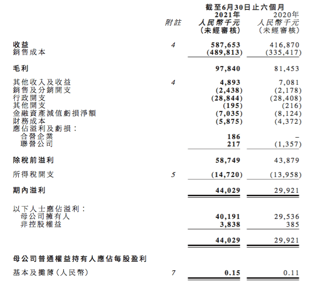 根据公告,公司实现收益5.88亿元(人民币,下同),同比增加41%;毛利9780万元,同比增加20.1%;毛利率为16.6%,较截至去年同期下跌2.9个百分点;溢利为4400万元,同比增加47.2%。