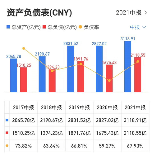 2019年上半年-2021年上半年,格力电器总负债1891.76亿元、1675.43亿元、2118.55亿元,负债率分别66.81%、59.27%、67.93%。