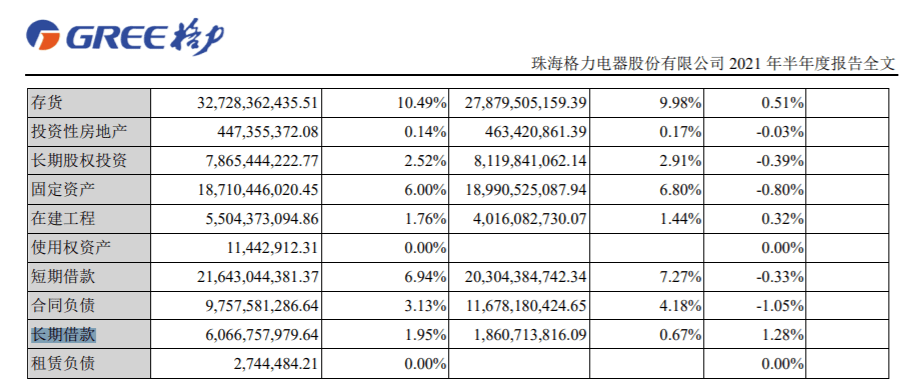 期内,格力电器长期借款为60.67亿元,占总资产1.95%,上年末为18.61亿元,占总资产0.67%。