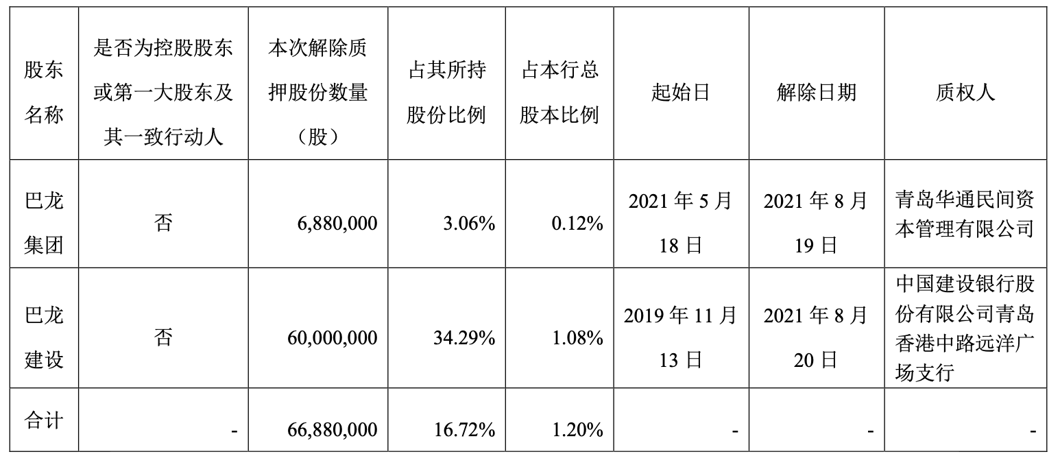 乐居财经讯 靳文雨 8月23日,青农商行(SZ002958)发布公告称,接到巴龙国际集团有限公司(以下简称“巴龙集团”)、巴龙国际建设集团有限公司(以下简称“巴龙建设”)函告,获悉巴龙集团、巴龙建设将所持有本行的股份部分解除质押及再次质押。