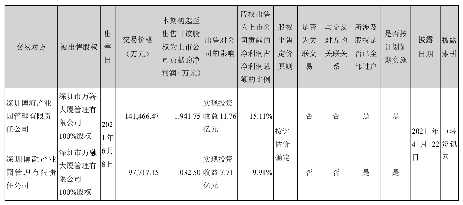 2021年上半年,招商蛇口将万海大厦和万融大厦100%股权分别转让给蛇口产园 REIT 之子公司深圳博海产业园管理有限责任公司及深圳博融产业园管理有限责任公司,交易价分别为14.15亿元和9.77亿元,实现投资收益11.76亿元和7.71亿元,贡献净利润占同期净利润15.11%和9.91%。