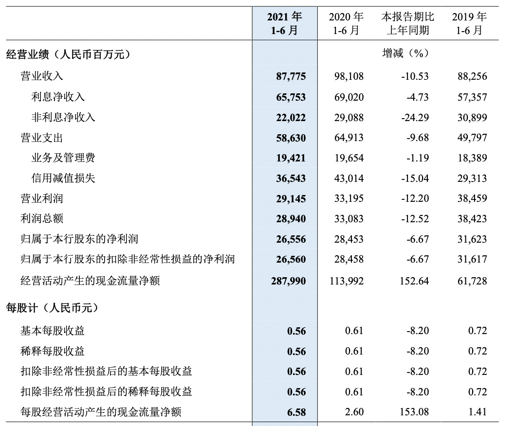 乐居财经讯 靳文雨8月27日晚,中国民生银行股份有限公司(以下简称“民生银行”)发布2021年半年度报告,报告显示,2021年1-6月份,公司实现营业收入877.75亿元,比上年同期减少10.53%;归属于该行股东的净利润为265.56亿元,上年同期为284.53亿元,同比减少6.67%;扣除非经常性损益后归属于该行股东的净利润265.6亿元,上年同期为284.58亿元,同比减少6.67%;基本每股收益0.56元,上年同期为0.61元.,较上年同期减少8.2%。