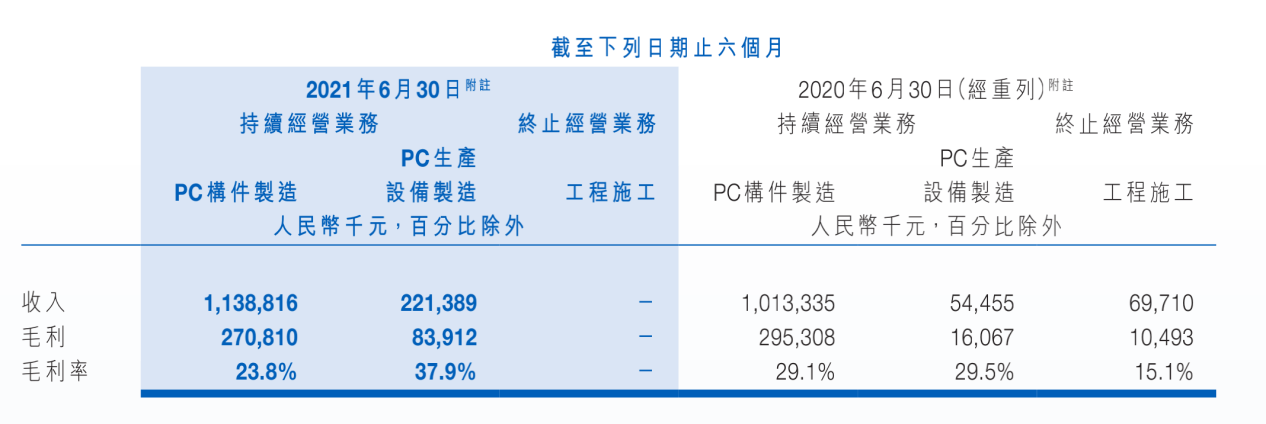 另外,PC生产设备制造业务收入2.21亿元,同比增长306.6%,毛利率则从29.5%上涨至37.9%。该项收入增长的主要原是去年受疫情影响的联合工厂在今年完成设备安装并验收,毛利率增加则是由于收入规模的增加,固定费用的分摊减少。