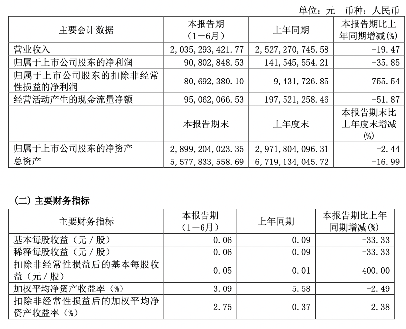 乐居财经讯 靳文雨 8月27日晚,维维食品饮料股份有限公司(以下简称“ST维维”)发布2021年半年度报告,报告显示,2021年1-6月份,公司实现营业收入20.35亿元,比上年同期减少19.47%;归属于上市公司股东的净利润为9080.3万元,上年同期为1.4亿元,同比减少35.85%;扣除非经常性损益后归属于上市公司股东的净利润8069.24亿元,上年同期为943万元,同比增长755.54%;基本每股收益0.06元,同比减少33.33%。