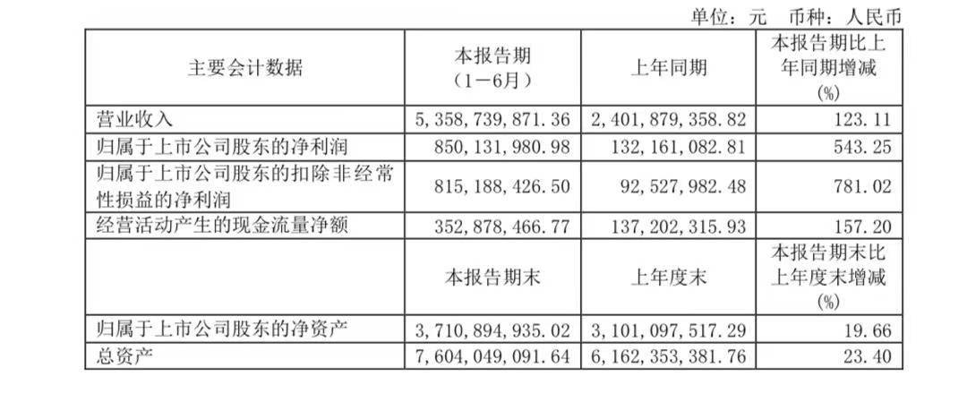 根据公告,公司实现营业收入营业收入53.59亿元,同比增长123.11%;归属于上市公司股东的净利润8.50亿元,同比增长543.25%。