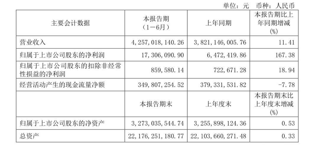 根据公告,公司实现营业收入营业收入42.57亿元,同比增长11.41%;归属于上市公司股东的净利润1731万元,同比增长167.38%。