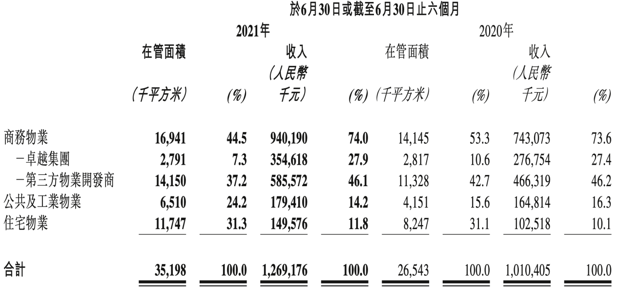 截至2021年6月30日,卓越商企服务的合约建筑面积约为5104万平方米,较2020年同期增长约37.8%,合约项目数量537个,同比增长34%;在管建筑面积约为3520万平方米,较2020年同期增长约32.6%,在管项目数量463个,同比增长40%。