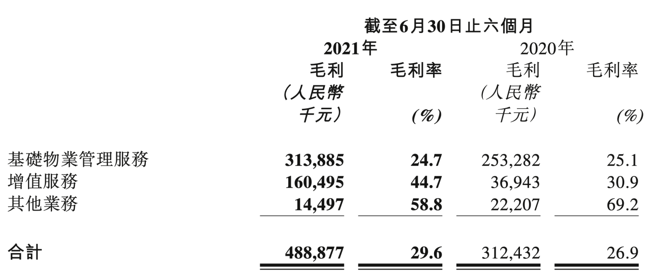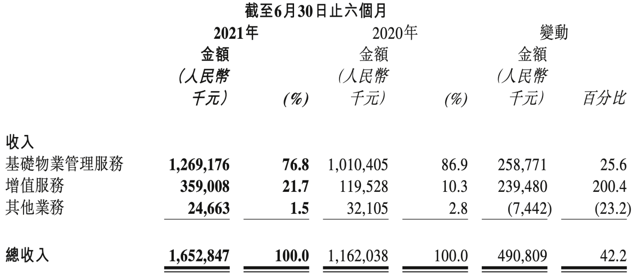 今年上半年,物业管理服务营收12.69亿元,同比增长25.6%,占总收入的76.8%;增值服务收入约3.6亿元,同比增长约200.4%,占总收入比例约21.7%,较上年同期提升了11.4个百分点。