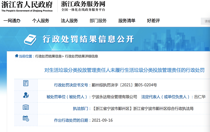 因此,浙江省宁波市鄞州区综合行政执法局认为,永达物业的行为已违反了《浙江省生活垃圾管理条例》第三十一条第一款第三项的规定。根据《浙江省生活垃圾管理条例》第四十六条的规定,对其作出罚款1000元的罚款。该行政处罚决定书文号为鄞州综执罚决字〔2021〕第05-0204号。
