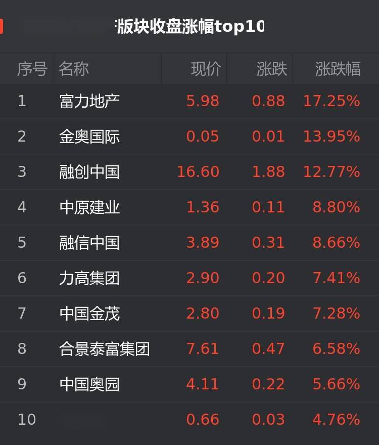 港股地产股板块收盘涨幅位居前十位的是,富力地产涨幅17.25%,金奥国际涨幅13.95%,融创中国涨幅12.77%,中原建业涨幅8.80%,融信中国涨幅8.66%,力高集团涨幅7.41%,中国金茂涨幅7.28%,合景泰富集团涨幅6.58%,中国奥园涨幅5.66%,华南城涨幅4.76%。