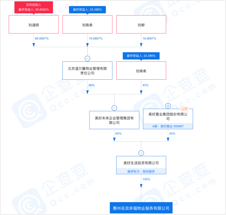 8月底,龙湖嘉悦物业与美好生活投资正式签约,完成对美好幸福物业100%股权的收购交易。同时,美好幸福物业人事大换防,法定代表人从美好未来副董事长、美好置业副董事长兼总裁吕卉变更为龙湖智慧服务集团湖北区域总经理颜廷强;原执行董事兼总经理吕卉、监事李丹2人退出,新增董事长王建辉、董事兼总经理颜廷强、董事杨杰以及监事陈俊颖。卖出美好幸福物业与“赎回”惠州名流物业的个中细节,美好集团与龙湖物业双方都没有进行太多信息披露,因此并不知道其中涉及的交易金额和具体在管面积。不过,相关资料显示,此前龙湖物业收购美好幸福物业交易中,涉及湖北、安徽、陕西重庆等全国10余个省份及城市的在管物业项目及其他服务项目,物业管理面积达600余万平方米。企查查显示,惠州名流物业“赎回”后,由美好未来与美好置业通过美好未来投资各自持股占比60%、40%;而刘道明作为实际控股人,穿透层层股权后的最终收益股份为26.67%。