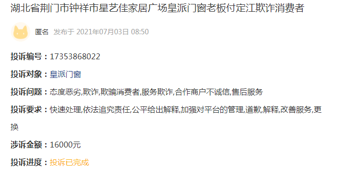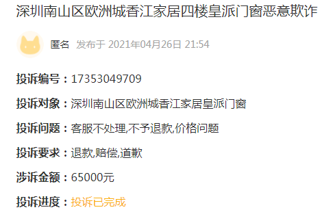 无独有偶,今年4月份,编号为17353049709消费者在黑猫投诉表示,“2021.3.16在深圳南山区欧洲城的香江家居四楼订购皇派门窗,至2021.4.25完成所有门窗安装。期间经历该店如下恶意欺诈和失信行为:1.销售单约定4.15交货,实际交货日期是4.25,整整推迟了10天,导致本人房屋装修进度严重延迟。2.订金收据约定阳台门价格包含纱门,买单时对方恶意加收纱门费用3000元。3.安装过程不需要吊车,对方恶意收取吊车费用2000元。4.对方收取300元外墙防水胶费用,实际并没有使用。5.阳台门量尺失误,拆除部分承重墙才能安装。”