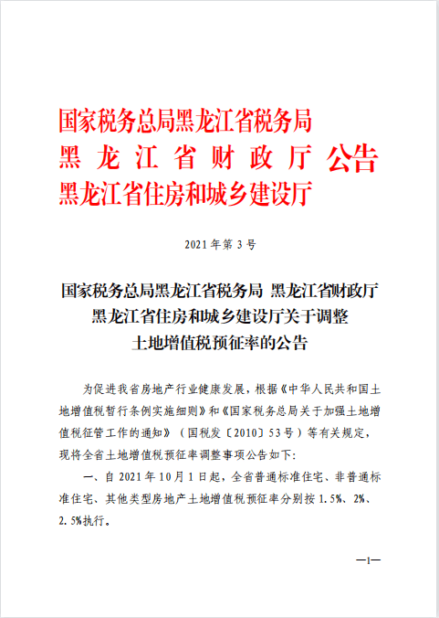 为促进黑龙江省房地产行业健康发展,拉动我省经济的稳步增长,根据《中华人民共和国土地增值税暂行条例实施细则》和《国家税务总局关于加强土地增值税征管工作的通知》,并对比东北区域相邻省份税收政策情况,国家税务总局黑龙江省税务局、黑龙江省财政厅、黑龙江省住房和城乡建设厅三部门对黑龙江省土地增值税预征率进行调整。