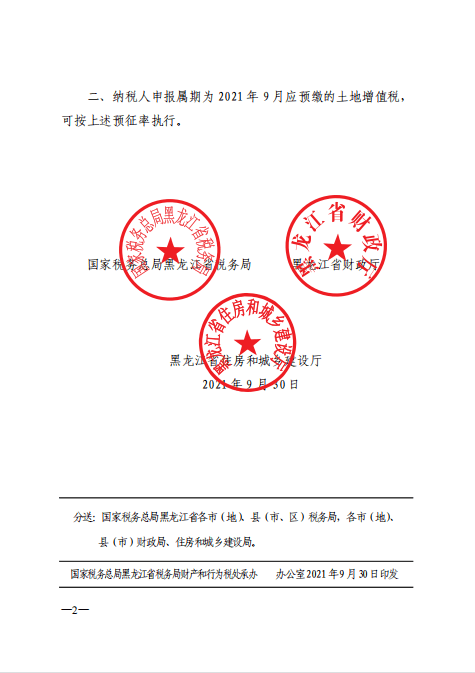 二、纳税人申报属期为2021年9月应预缴的土地增值税,可按上述预征率执行。