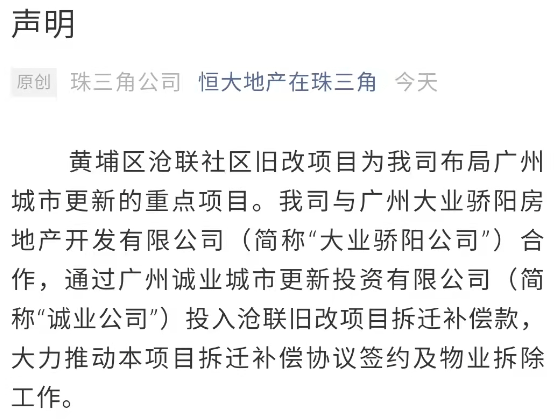乐居财经讯 赵微10月8日,据“恒大地产在珠三角”微信公众号10月8日消息,恒大地产集团珠三角房地产开发有限公司发布声明称,网络上近日出现的有关恒大集团退出沧联项目旧改工作的言论完全失实。