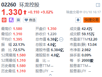 富途资讯1月10日消息,$环龙控股(02260.HK)$暗盘高开10.7%,截至发稿,涨9.02%,报1.33港元。