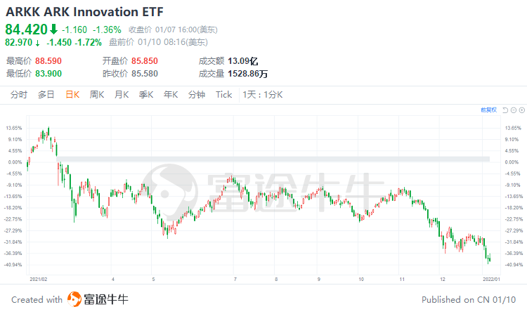 凯茜-伍德的方舟投资公司上周连续五天出售特斯拉股票,虽然自去年9月初以来,伍德的基金一直在断断续续的减持特斯拉股票,但像这样连续五天卖出的情况还是非常罕见。在周五的交易后,伍德旗下三只ETF仍持有特斯拉约159万股,价值逾16亿美元。在去年下跌近24%后,伍德的旗舰基金$ARK Innovation ETF(ARKK.US)$新年迎来开门黑,首周暴跌近11%。上周,ARKK的成交价一度触及82.65美元,与去年2月15日创下的158.823美元的高点相比,跌幅达47.96%,接近腰斩。截至周五收盘,其价格回升到84.42美元,但与高点相比回撤依然达到46.85%。