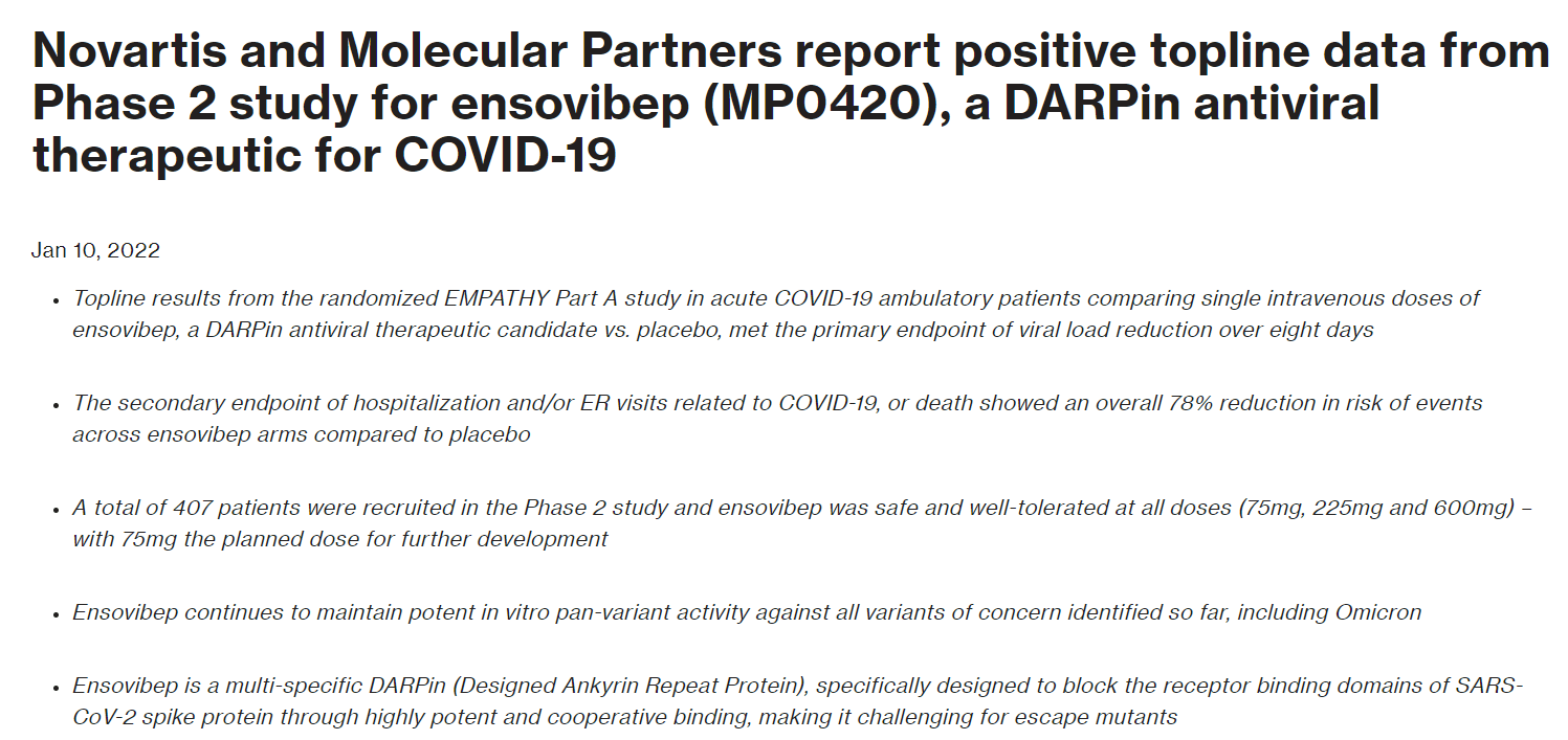 欧洲当地时间周一,发布公告称,鉴于良好的Ⅱ期实验数据,将行使对旗下新冠药物Ensovibep(MP0420)的商业化权利。