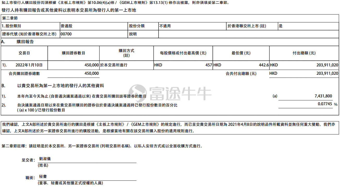 据港交所公告,$腾讯控股(ADR)(TCEHY.US)$今日以442.6港元-457港元的价格回购45万股股份,耗资约2.04亿港元。