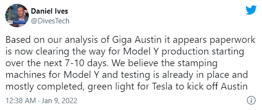 近日Wedbush董事总经理兼高级股票分析师Daniel Ives表示,$特斯拉(TSLA.US)$德州奥斯汀的工厂将在未来 7-10天内开始大规模生产。Ives表示:「根据公司的分析,目前的文书工作已经全部完成,为生产扫清了道路,特斯拉很可能将在未来7至10天开始生产Model Y。我们相信Model Y的冲压机器和测试已经到位。」