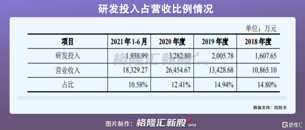 报告期内,骄成股份的研发投入金额分别为1607.65万元、2005.78万元、3282.80万元、1938.99万元,占历年营业收入比重分别为14.80%、14.94%、12.41%、10.58%。