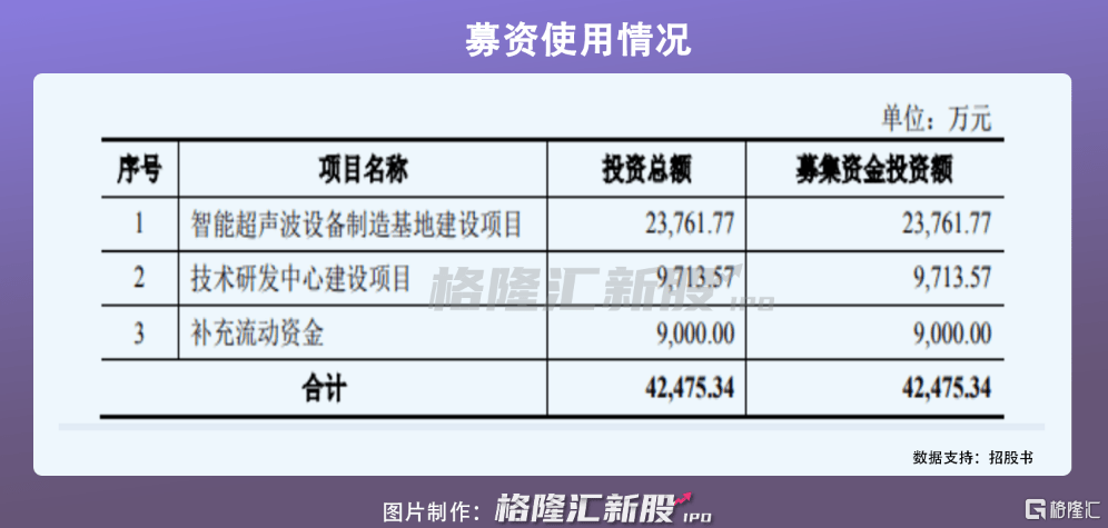 本次IPO拟募集资金4.25亿元,主要用于智能超声波设备制造基地建设项目、技术研发中心建设项目及补充流动资金项目。