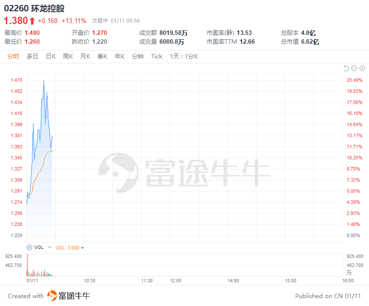 富途资讯1月11日消息,造纸毛毯制造商$环龙控股(02260.HK)$首日高开4.1%,随后持续走高,截至发稿,现报1.38港元,较招股价涨13.11%,成交额近8020万港元。