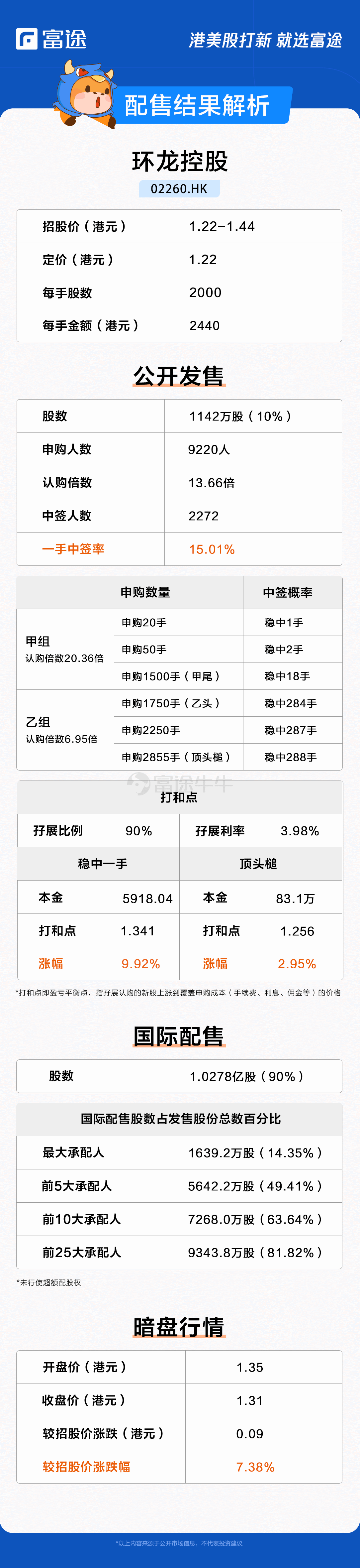 据此前公开信息,环龙控股公开配售申购人数9220,一手中签率15.01%,认购20手稳中一手。富途资讯整理相关数据如下表: