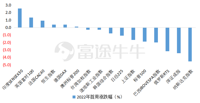 另一方面,美联储紧缩预期影响股市风险偏好。美联储2021年12月议息会议纪要表态鹰派程度略超预期,海外加息预期愈发浓烈,部分投资者甚至开始担心美联储年内缩表,10年期美国国债收益率跳升,风险资产受到冲击。2022年1月1日至1月7日,美国十年期国债收益率由1.52%上升至1.76%,美国股市整体呈下跌趋势,纳斯达克指数下跌4.5%,道琼斯工业指数下跌0.29%,其他全球重要指数也受到了不同程度的冲击。