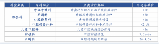 先介绍一下行业情况,口腔医疗业务可以根据所属科室分为4类:综合科、儿童口腔科、种植科、正畸科。其中综合科可进一步细分为牙体牙髓科、牙周科、口腔外科、口腔修复科。综合科与儿童口腔科主要开展综合诊疗业务,而种植科与正畸科则开展专科诊疗业务、客单价水平较高。