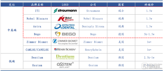 市场格局方面,种植体主要可分为低端进口(韩国为主)与中高端进口(瑞士/瑞典为主)两类品牌。