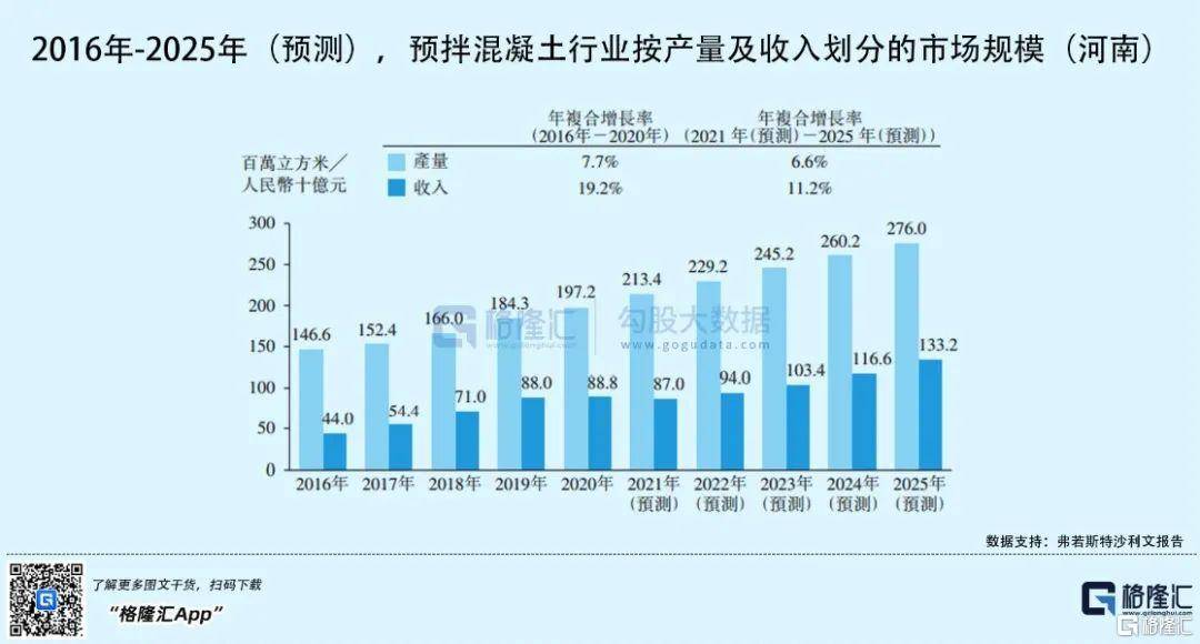 近年来,随着河南省城镇化进程的加快,房地产建筑项目和基建的发展,河南省混凝土和其他建材的需求也在持续上升,河南省的预拌混凝土的产量以年复合增长率7.7%从2016年的1.47亿立方米增加至2020年的1.97亿立方米。与此同时,其预拌混凝土市场规模也以年复合增长率19.2%,从2016年的440亿元扩大至2020年888亿元,并预计到2025年将增至1332亿元。