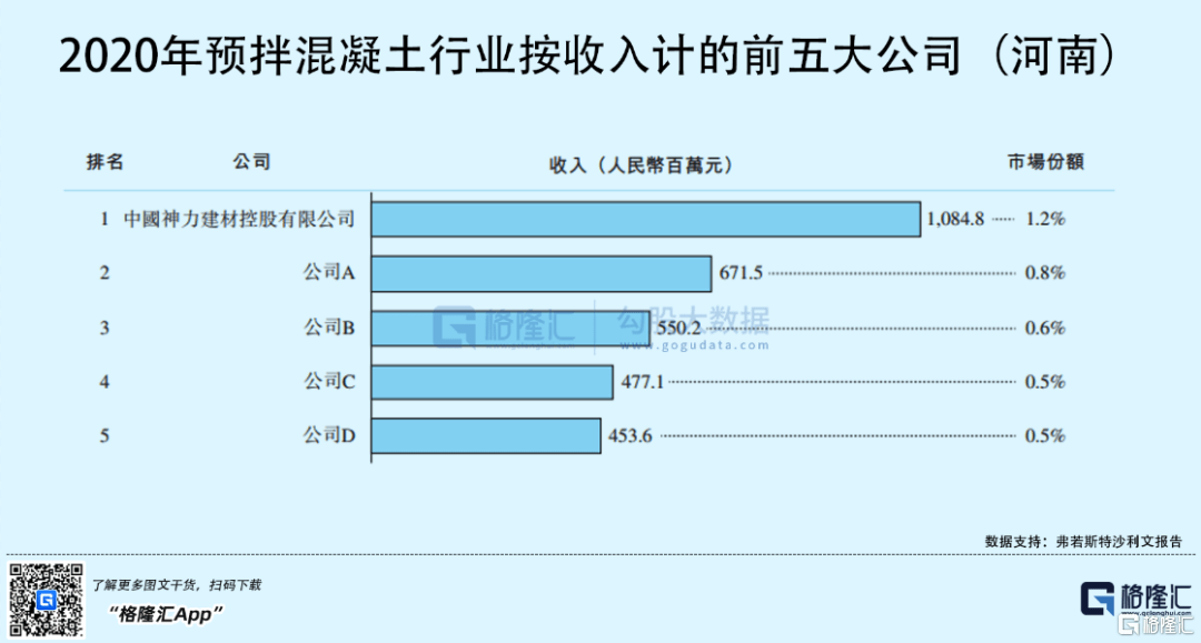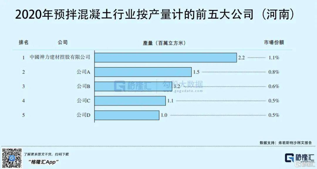 按2020年收入和产量计,神力建材是河南省最大的预拌混凝土生产商,在河南省的市场份额分别约为1.2%及1.1%。