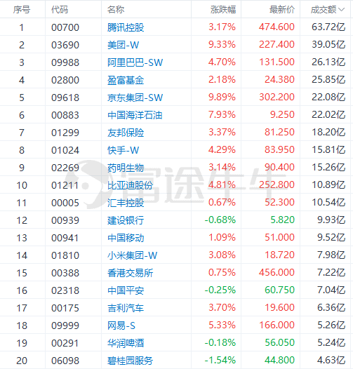 板块方面,大型科技股集体走强,京东涨近10%,美团涨超9%,百度、阿里、快手涨超4%,哔哩哔哩、腾讯、小米涨超3%。
