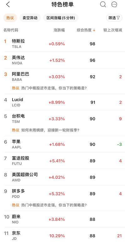 据富途牛牛美股交易热度榜显示,排名靠前的美股包括特斯拉、英伟达、阿里巴巴、Lucid、台积电、苹果等。