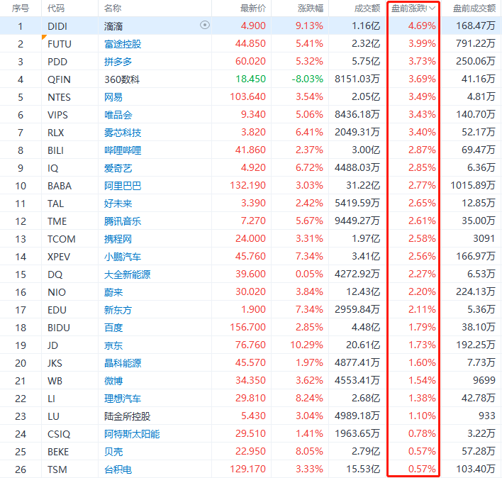 热门中概股盘前继续上涨,滴滴涨近5%,拼多多涨近4%,网易、B站、阿里涨近3%,小鹏汽车、蔚来、百度、京东涨近2%。