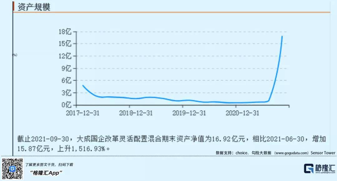 从基金规模来看,一般来讲体量较小的基金比体量大基金更容易跑出超额收益。从最新的报告期来看,随着基金净值的涨幅,大成国企改革灵活配置混合基金的规模逐步扩大,但是截止到2021年三季度末,资产净值为16.92亿元,相比2021-06-30,增加15.87亿元,上升1516.93%。