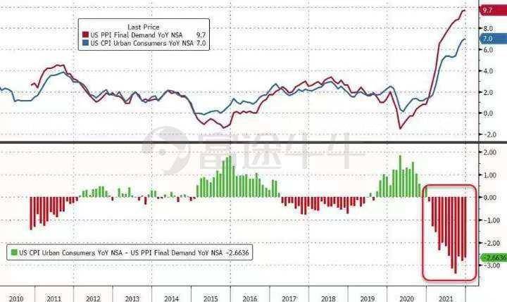 1月13日周四,美国劳工部发布的数据显示,美国12月PPI同比增长9.7%,增幅为2010年以来最高水平,高于前值9.6%,不及市场预期的9.8%。环比上涨0.2%,创2020年11月以来新低,前值为0.8%。剔除波动较大的食品和能源,美国12月核心PPI同比增长8.3%,远高于市场预期的8%,前值为7.7%。