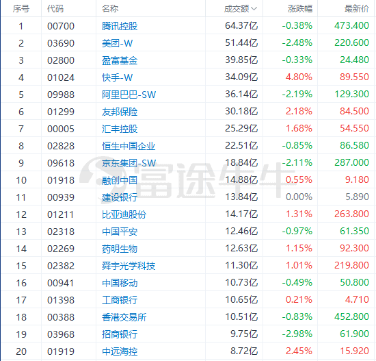 今日港股成交额TOP20