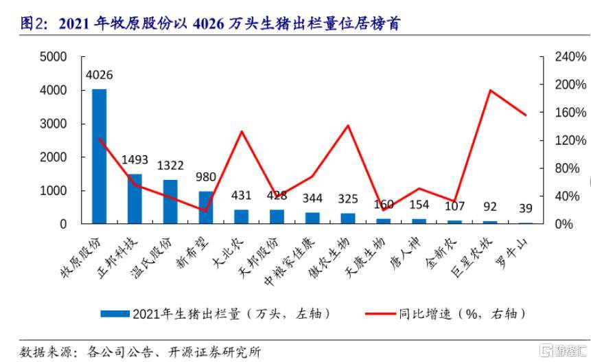 从产值方面看,牧原股份位居生猪销售榜首。据开源证券,2021年13家养殖上市公司合计销售生猪9901万头,其中牧原股份以4026万头的生猪出栏量位居榜首,正邦科技、温氏股份、新希望、大北农的生猪出栏量排在前五。