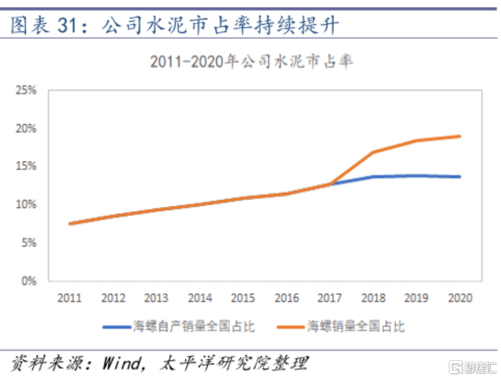 规模上,因为水泥市场分布有较强的地域性,大大小小的水泥厂分布在全国。但海螺水泥从2011年至2020年市场占有率稳步上升。截至2020年,海螺水泥的市场占有率已经达到20%。