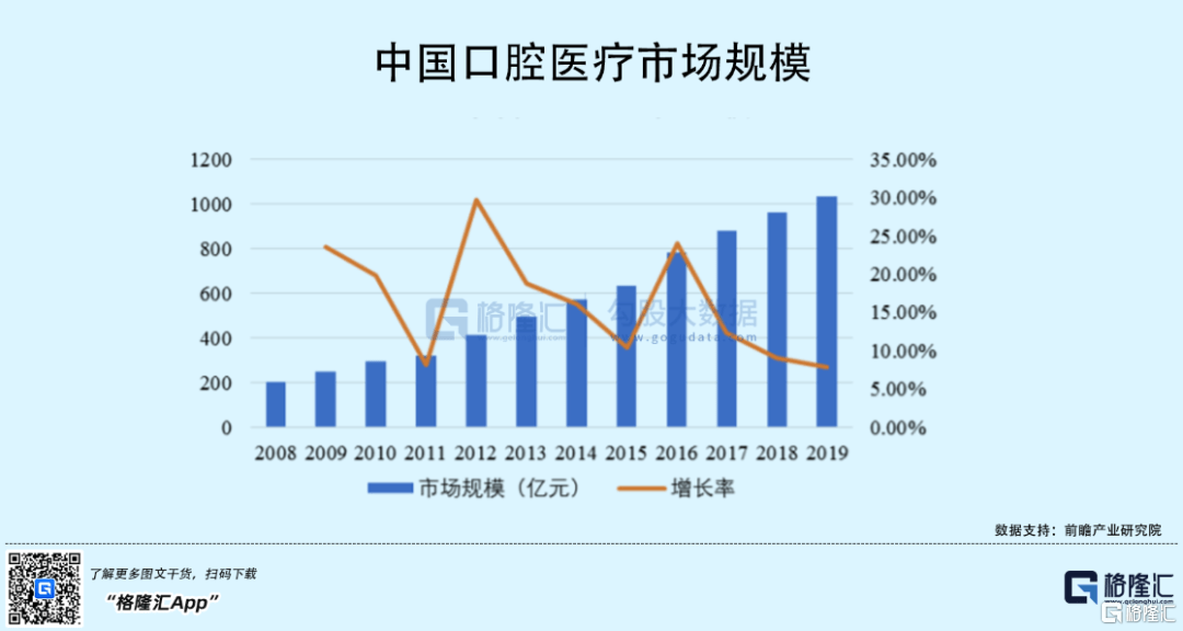 随着人口老龄化以及可支配收入的提高,中国口腔医疗市场处于稳定增长的阶段,2019年市场规模达到1035亿元,同比增长7.81%。