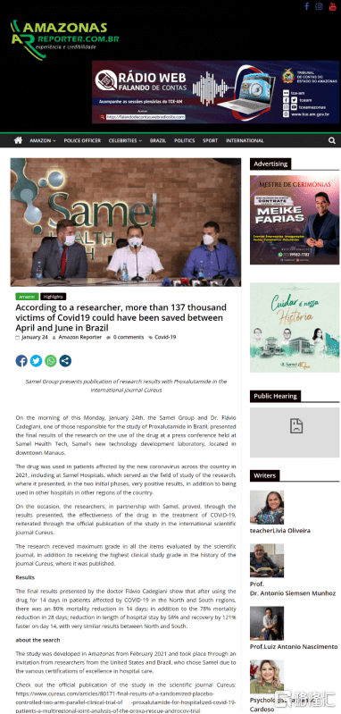 当地时间2022年1月24日,巴西Samel医院和Flávio Cadegiani医生在玛瑙斯举行了新闻发布会,会上展示了普克鲁胺在巴西治疗重症新冠患者研究者临床试验的最终亮眼数据。Samel医院和Flávio Cadegiani医生是此项试验的临床中心医院和主要研究者之一。