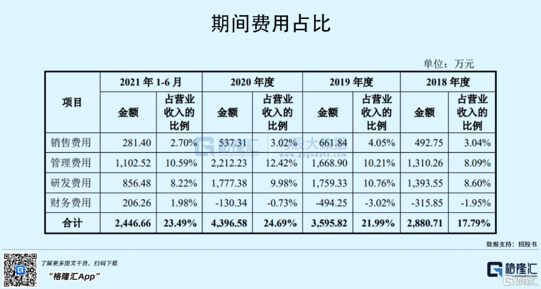 报告期内,公司期间费用分别为2880.71万元、3595.82万元、4396.58万元和2446.66万元,占同期营业收入的比例分别为 17.79%、21.99%、24.69%和23.49%,期间费用呈现增长的趋势。
