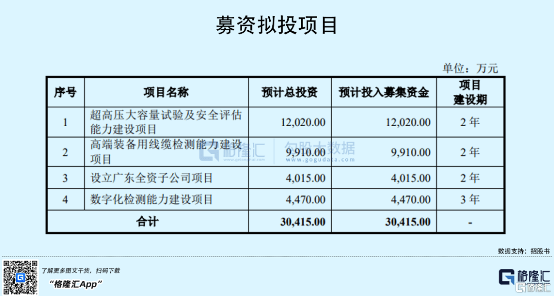 国缆检测本次拟募集资金3.04亿元,资金将用于超高压大容量试验及安全评估能力建设、高端装备用线缆检测能力建设、设立广东全资子公司、数字化检测能力建设等项目。