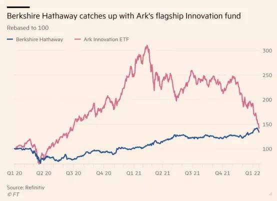 这图里的红线是2020年以来木头姐管理的基金净值,蓝线就是巴老爷子伯克希尔的股价走势。