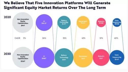 根据ARK的测算,这五大行业从2020年到2030年这十年内,年均复合增长率将分别提升26%、35%、43%、51%和40%。